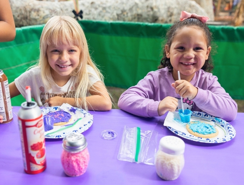 Two children decorate sugar cookies with icing and sprinkles at Irvine Park Railroad’s Easter Eggstravaganza
